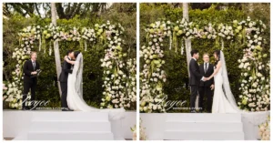Emotional Ceremony Moments Bride and Groom Holding Hands & First Kiss Under Garden Arch