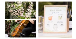 Wedding Reception Details Floral Centerpiece, Custom Bar Menu, and Live Violin Performance