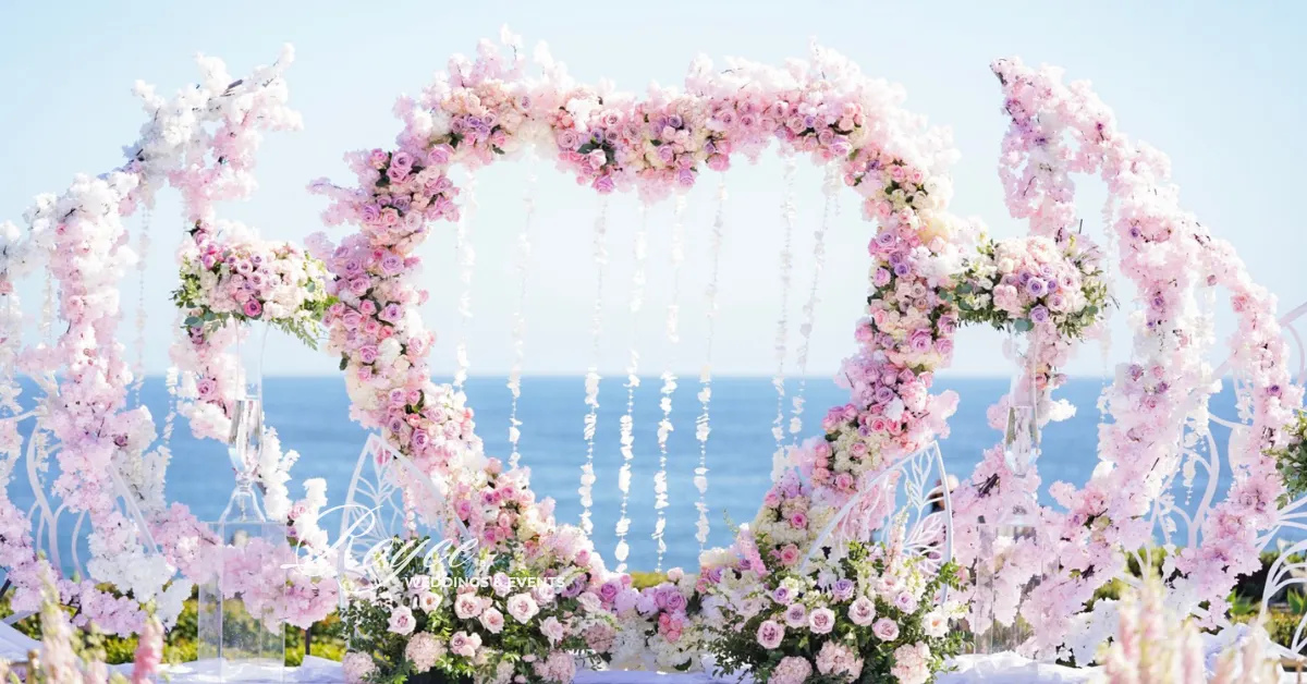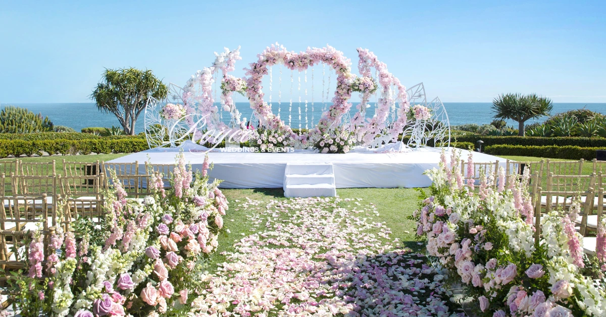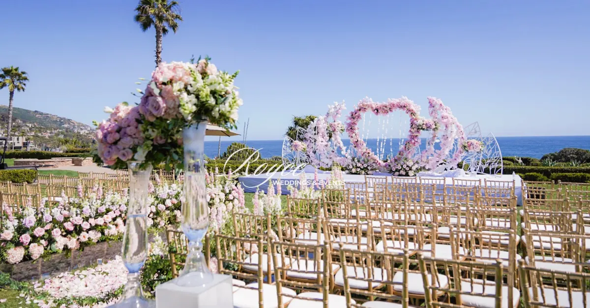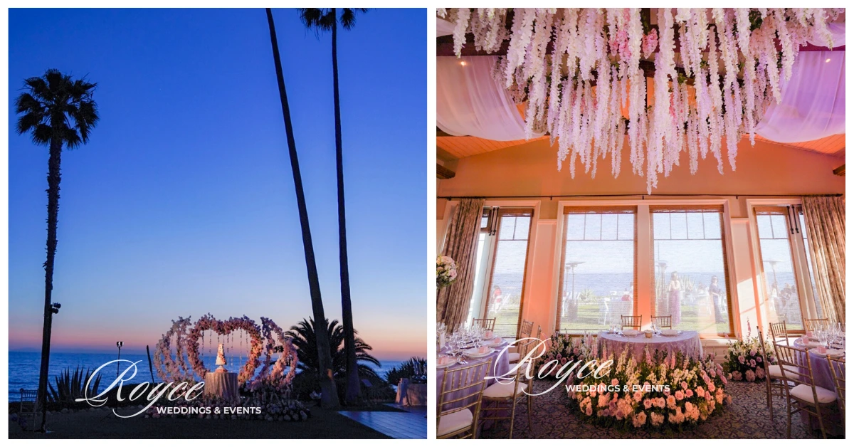 The lovely couple’s big day is full of love and togetherness! The wedding couple’s luxury Montage Laguna Beach outdoor wedding makes the most of the dazzling ocean backdrop. The California weather is warm enough for a gorgeous outdoor ceremony. And then, the Royce Weddings team perfectly transforms the couple’s vision of their wedding into reality. For instance, the venue is elegant with its clean, romantic, and aesthetic color palette florals, and designs. Certainly, the lush ivory and blush florals look dreamy and elegant. Moreover, it perfectly features a positively gorgeous heart-shaped wedding ceremony arch.