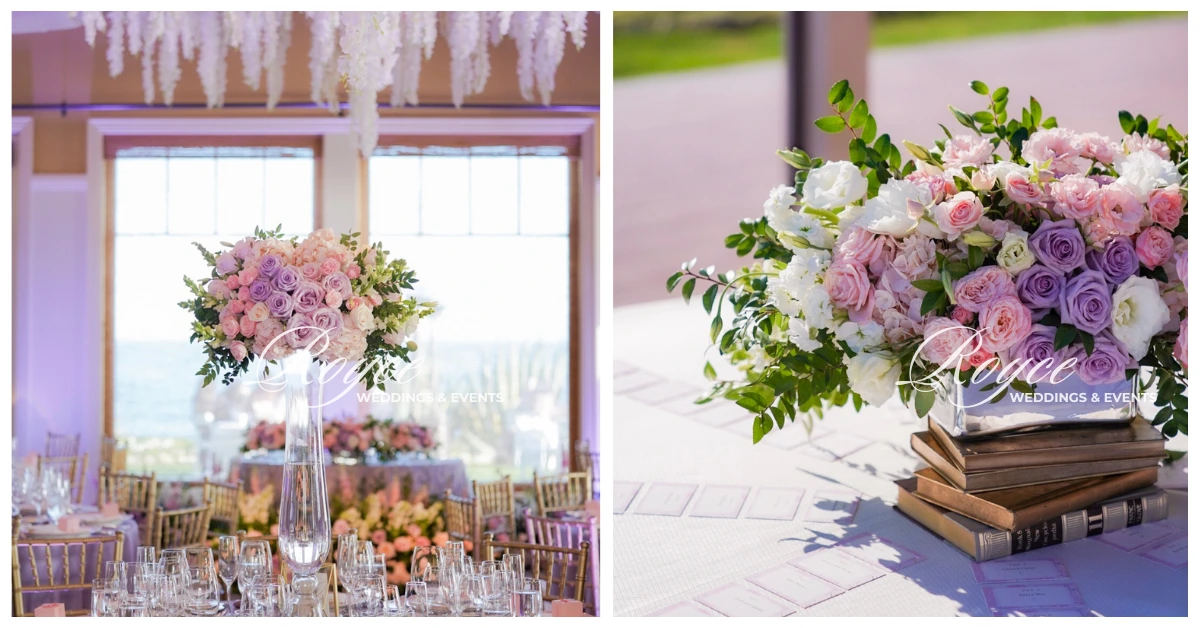 After the stunning oceanfront wedding ceremony, an equally spectacular ballroom reception follows. An empty yet grand ballroom space transforms into a whimsical wedding reception. It is filled with combinations of luxurious linens, a floral chandelier, elegant details, beautiful blooms, gorgeous centerpieces, and tablescapes. All are dazzling in blush and pastel palettes.