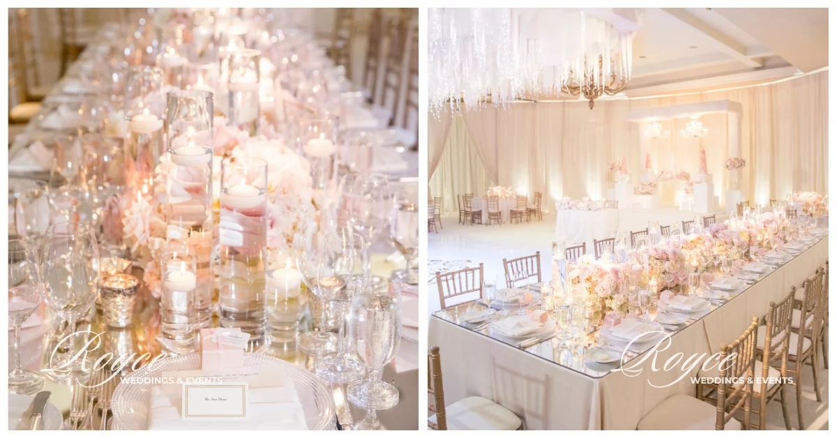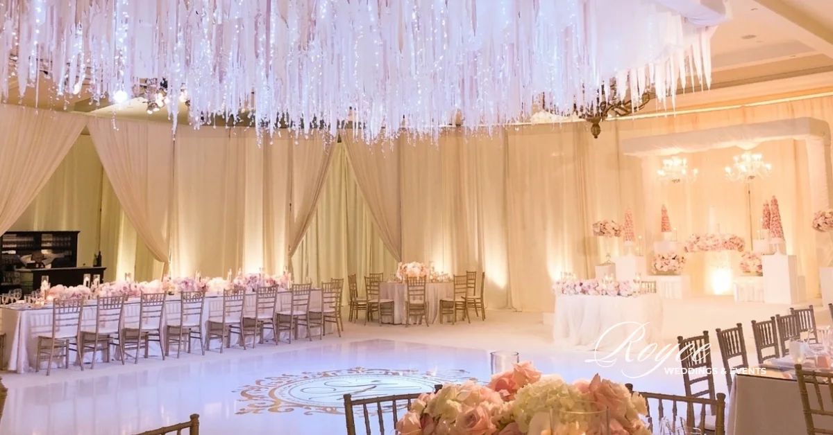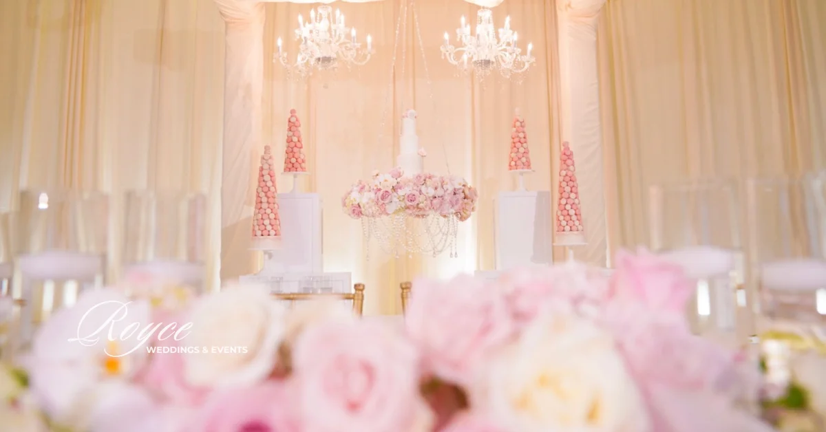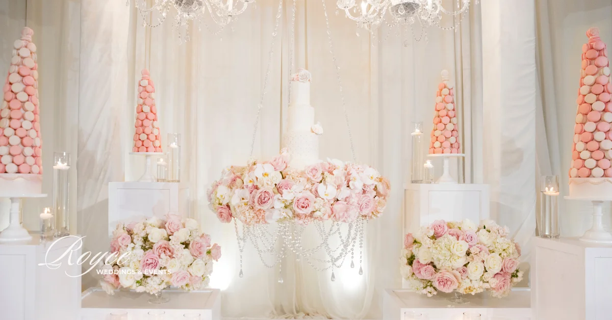 The ballroom is perfect in its circular setting. It offers a comfortable and elegant reception setting. Certainly, the wedding was full of beautiful details from the ceiling to the floor. Above all, everything comes together seamlessly for their big day! The gorgeous floral arrangements throughout the ballroom and the stage look perfectly great with the dessert display.