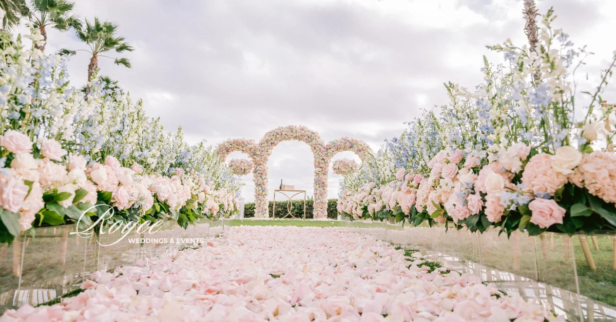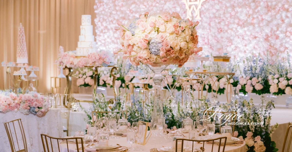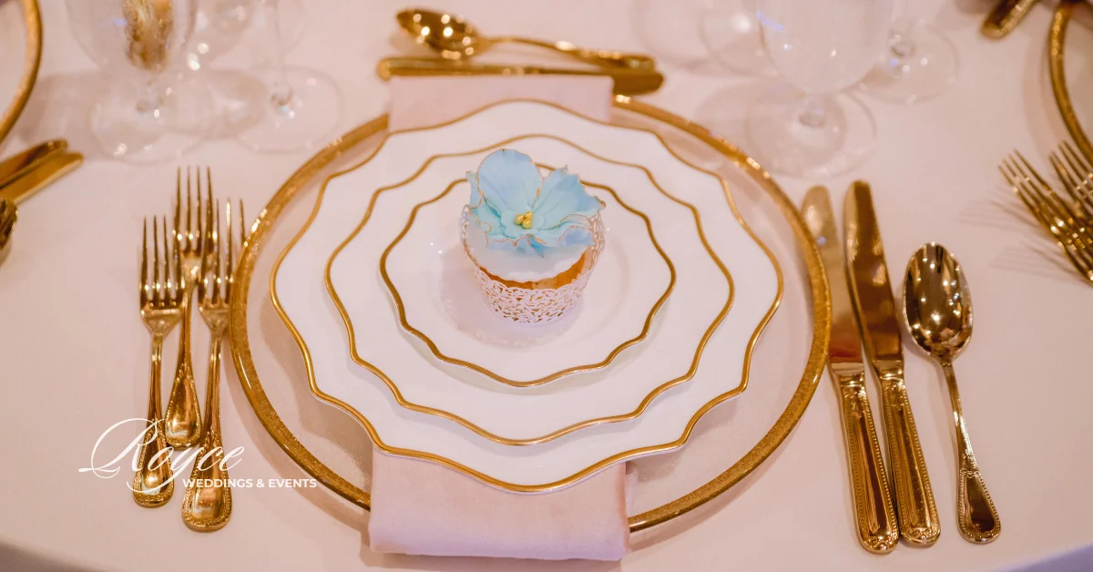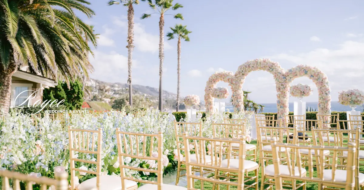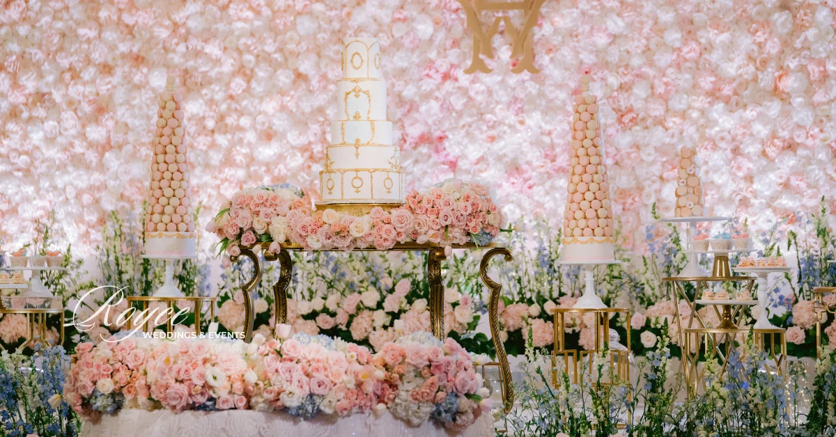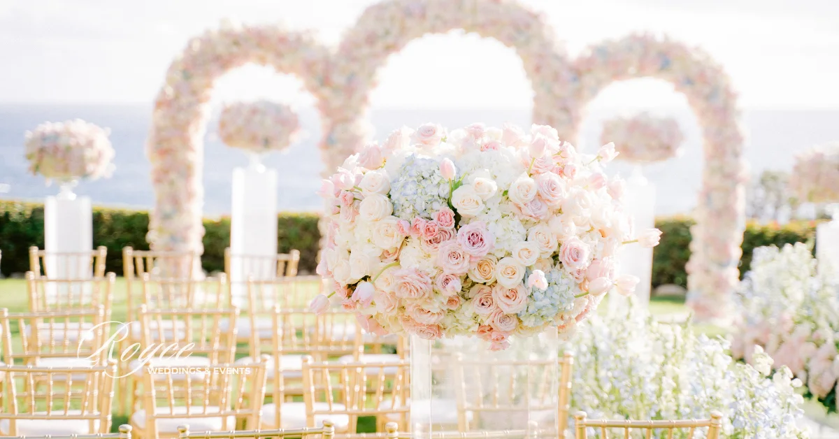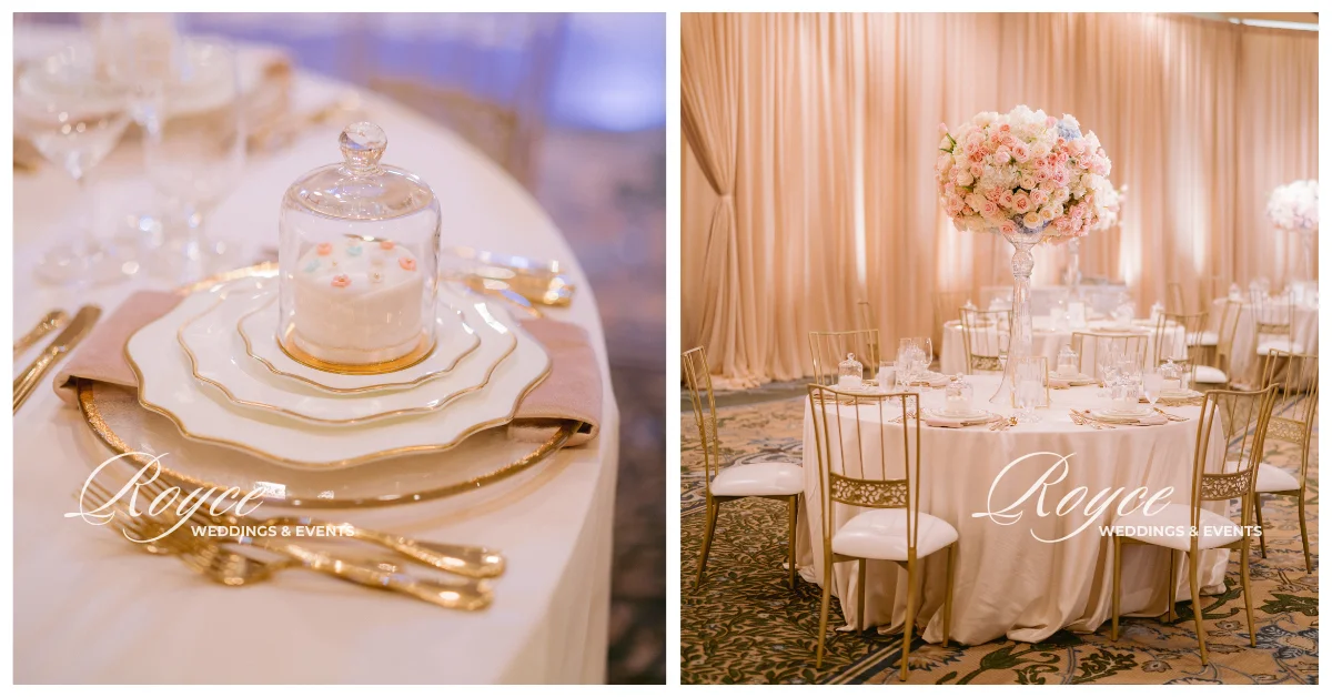Finally, wedding guests headed to the prepared reception ballroom. They can spend the time dancing and dining together. They can also feast on the gorgeous wedding cake. Certainly, Royce Wedding planning and coordination made sure that the reception would be as dreamy as the fairytale oceanfront wedding ceremony. Hence, the room is filled with soft lights, pastel florals, sparkly gold details, classic ivory cake, and stunning tablescapes. See all of the magical & whimsical wedding details in the gallery!