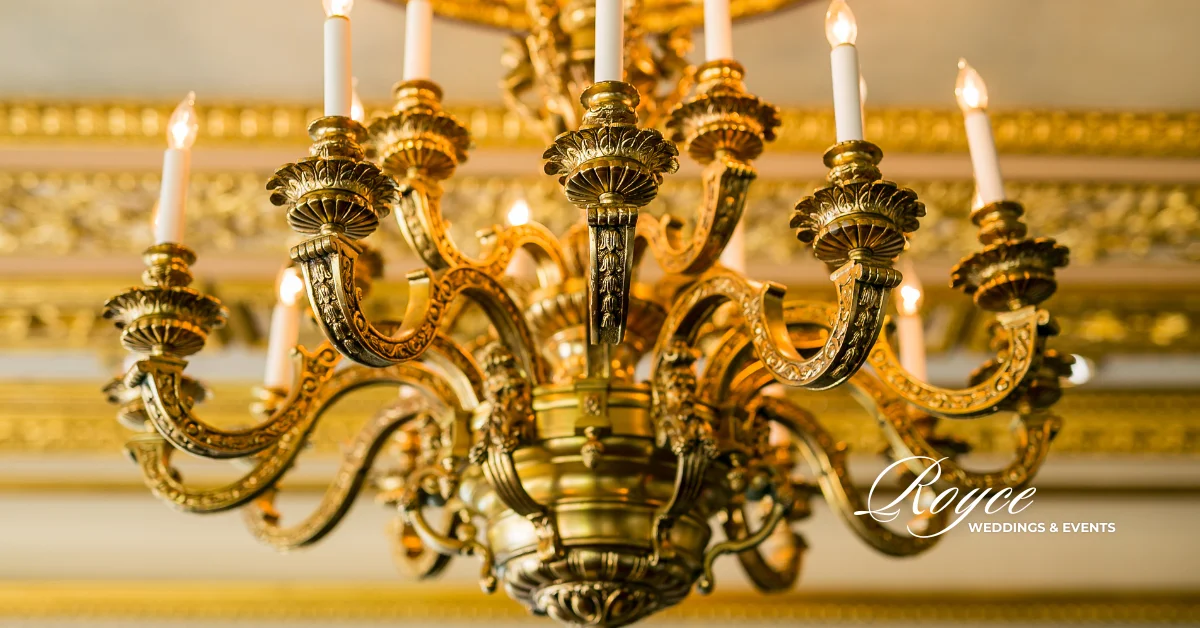 The couple’s ballroom reception is purely magical. The gold-outlined ceilings and opulent walls of the venue are the most lovely setting for their summer soiree. The bride says: “It was important to me that I not look back on my wedding photos in a decade and have regrets about choosing elements that are trendy, or of the moment.” soft candlelight and cream & ivory color floral centerpieces illuminate the reception.